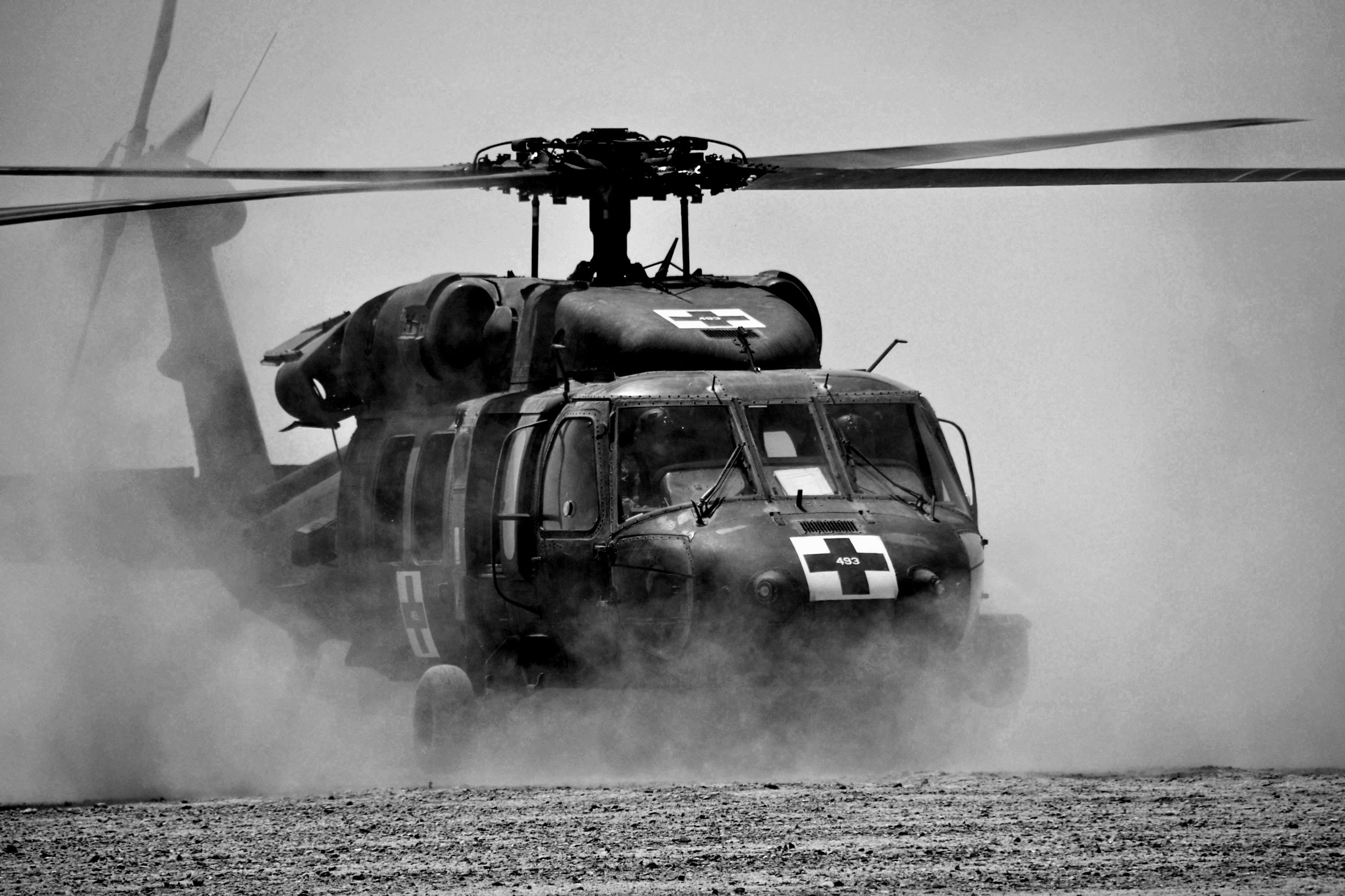 Before we knew it, a Dustoff Blackhawk UH-60 appeared at low altitude, soaring toward the cleared road where a HUMVEE with a giant white square and prominent red cross was waiting for the aircraft’s precious cargo. The pilot didn't hesitate once he saw the preparation was complete—he landed immediately, the wounded were loaded in the HUMVEE sprinting towards the field hospital.